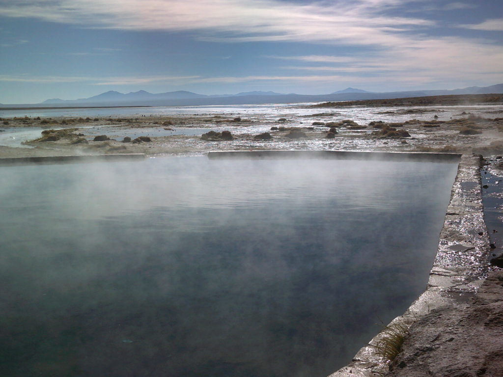 The next day we left very early when it was still night outside to go to a geysir area. It was very different than the ones in Yellowstone, since they don’t break out here, but just cook slowly. The next stop was near a outside pool, powered by volcanic activity, where we first had breakfast (pancakes!) and then went to relax in the pool. After that we went to a lake, that should have been green but was not because there was not enough wind.Then we were on our way back, and in Uyuni took a night bus to Tupiza.