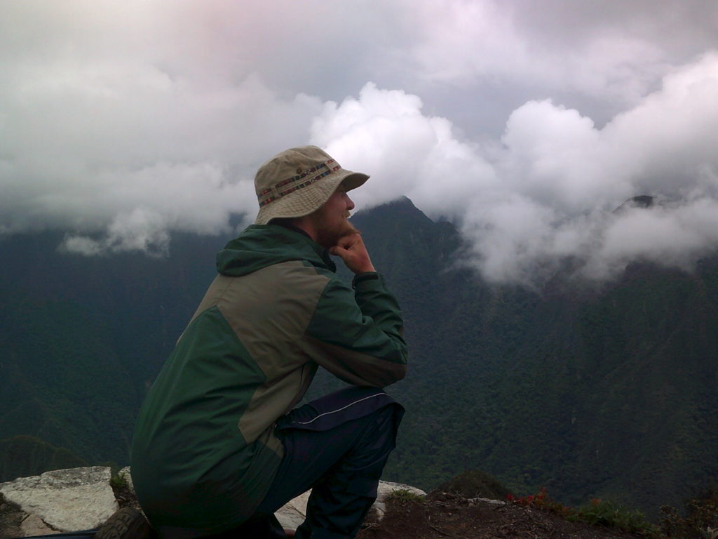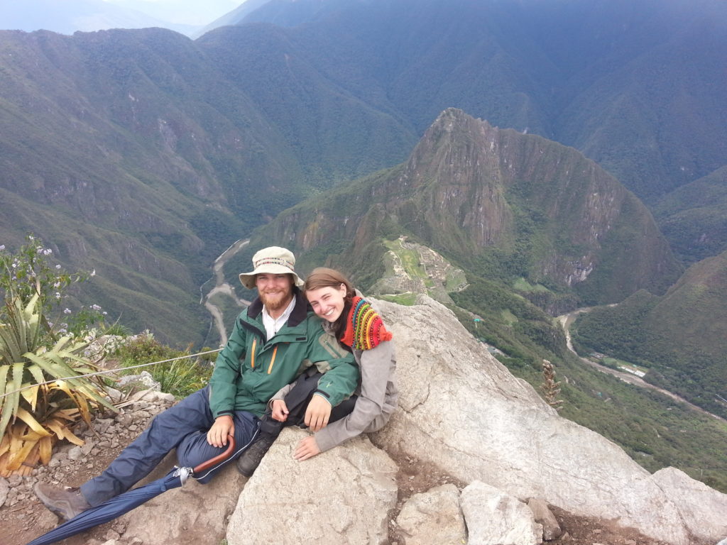 The next day we had our alarm clock set for 4:30 am to go up to Machu Picchu, but since it was raining we took our time. After hiking up the 1400m to the ruins we had breakfast and then went looking for a guide. The next tour was a Spanish speaking tour, and because after 2 months in Peru we are pretty confident in our language skills we joined them. It was very interesting and the guide spoke very good English so he could fill in the blanks of what we didn’t understand. In the morning the ruins were a very mystical sight with the clouds going through the old stones, and at nine o’clock the clouds cleared up and we could look at the whole city. Our entrance ticket to Machu Picchu Mountain was only valid between 9 and 10, so right after the tour we hiked up the mountain. We were about to give up a few times, since our legs hurt so much but the sight from the top was reward enough.