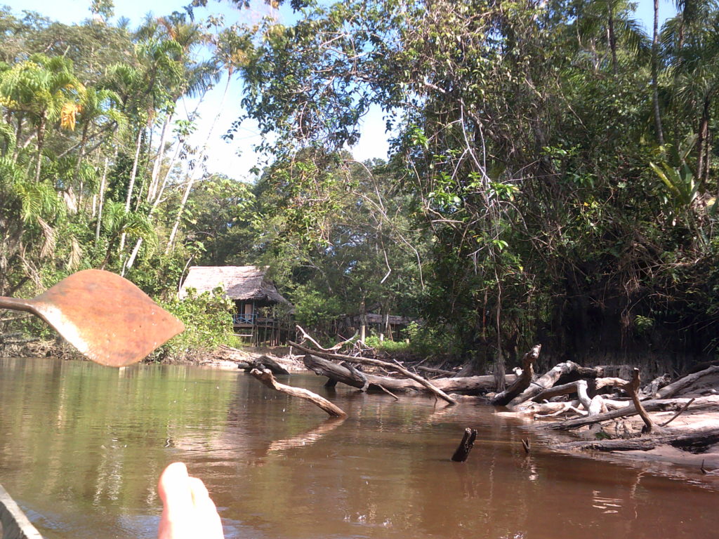 On the forth day we took another hike in the forest to a small lake. On the way we tried our first cacao fruit and there was a Liana swing where we could swing like Tarzan. Including the sounds. For the night we went back to Gloria. Since the waterlevel went down quite a bit, and we had to paddle upstream, the way back was quite hard for the two guides and Neil.