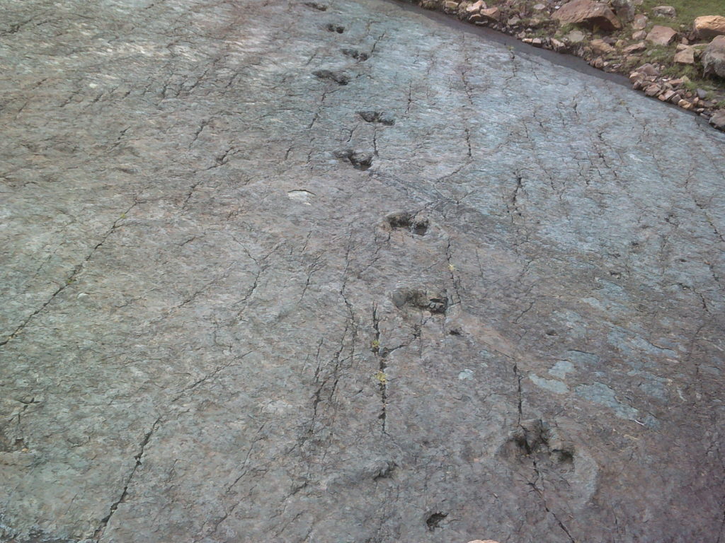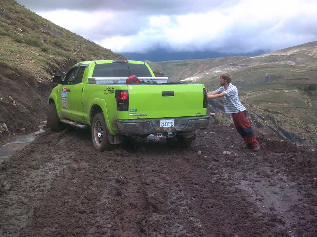 Luckily some people came by in a truck and we caught a ride direction: ninu mayu. Because of the rain in the night before the streets were very muddy and we had to get out and push a few times. In the end we were all muddy too. By the time we arrived in ninu mayu the sky was quite cloudy. After we paid an entrance fee, which we probably didn’t have to pay, to an old women we saw the dinosaur prints. The woman told us about a path to potolo, the next city we wanted to go to. Since the weather was looking bad and the prints were like „meh“ we went on uphill in the direction of the path. After 200 meters it was raining so badly that we set up camp. After a night of rain it was a beautiful morning and Max hung up our stuff for drying, including his clothes that got wet in the hostel. And that is the story how Max forgot pants, a T-shirt and socks next to dinosaur footprints.