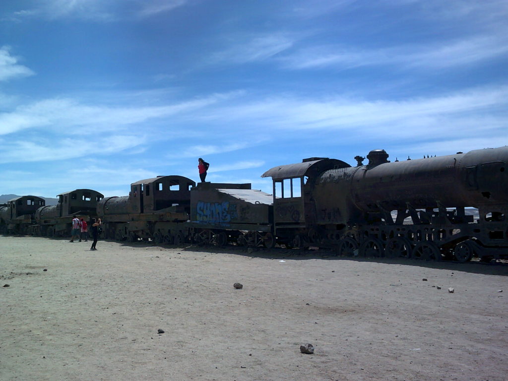 When we arrived in Uyuni with the two french girls, Montaine and Garance, our first goal was to find a hostel and a tour for the trip to Salar de Uyuni, the biggest salt desert in the world. A cheap hostel was quite difficult to find, but tour companies were all over the place. We went with the company that seemed the most organized. Since the tour only started at 10:30 am we got some coffee first before going into the desert. In our tour group there were two more people, two guys from Switzerland. After stopping at some tourist street right outside the desert, we got our first view of the salt flats. At first the floor was very brown because over the last months there had been a lot of wind that brought in a lot of earth from outside the desert, but later the floor was all white. We had our first break at a salt hotel, where we got some food at then went on to the „island“ in the middle of the desert, which used to be a corral reef. There were a lot of old cactuses and from the top we had an amazing view of the white desert.